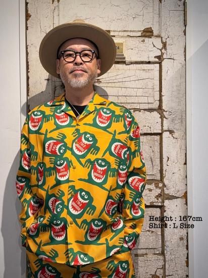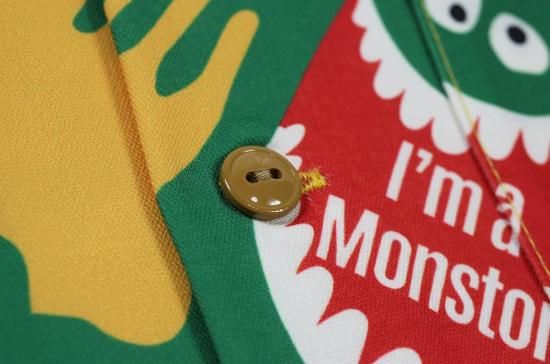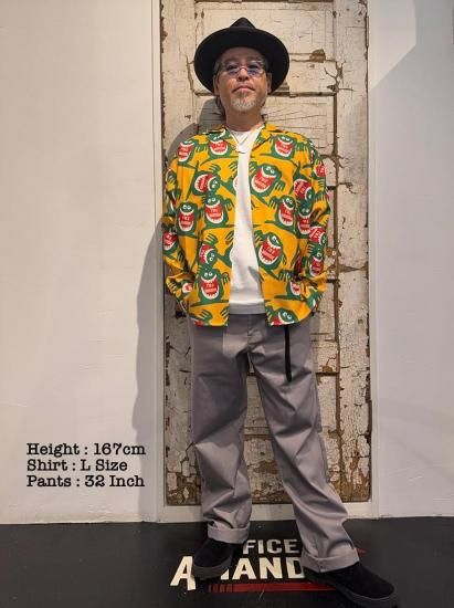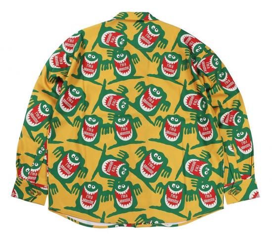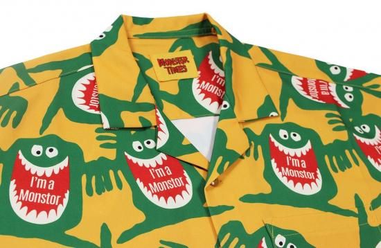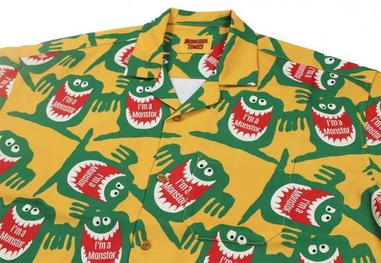 1960年代後半にお菓子メーカーから発売されたジュースの広告から誕生した“喉の渇きを襲うモンスター”を全面に配した総柄プリントシャツ。
